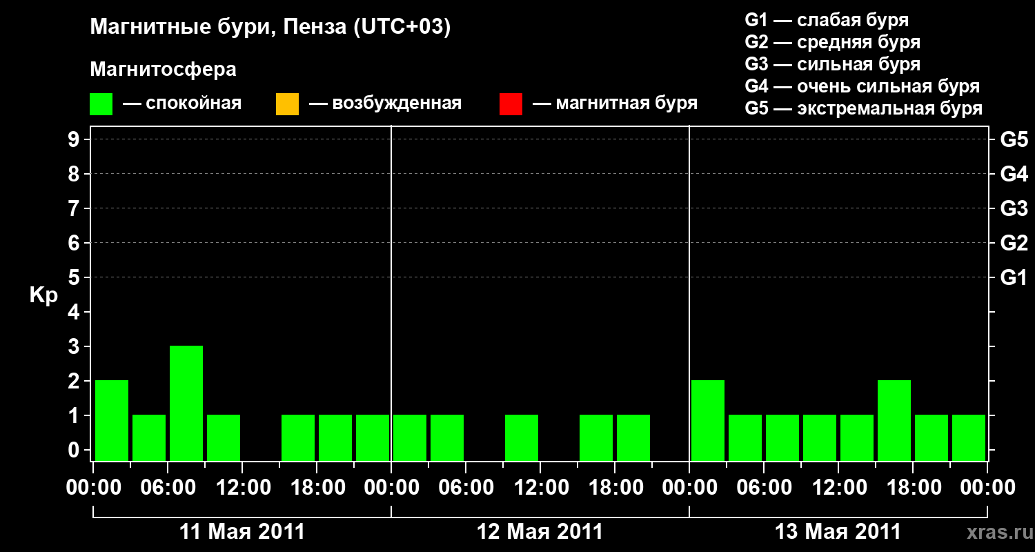 Изменения геомагнитного индекса Kp с 11 по 13 мая 2011 года для средних широт