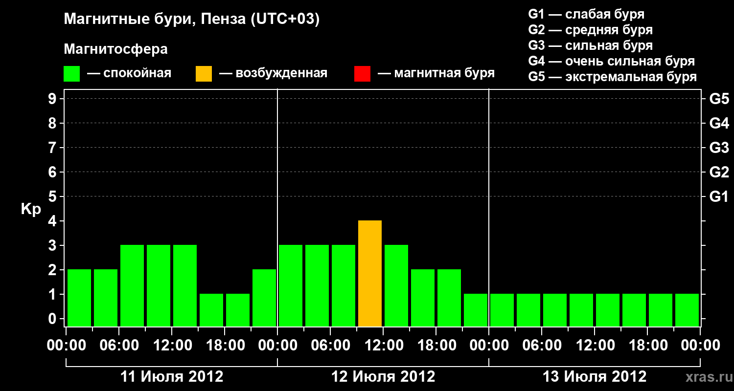 Изменения геомагнитного индекса Kp с 11 по 13 июля 2012 года для средних широт