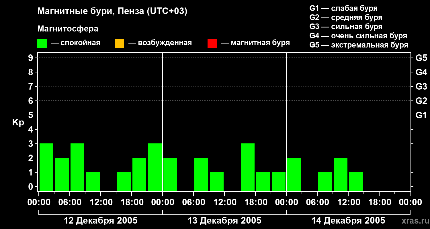 Изменения геомагнитного индекса Kp с 12 по 14 декабря 2005 года для средних широт