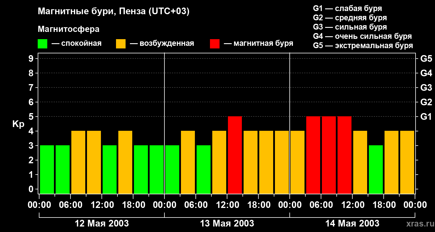 Изменения геомагнитного индекса Kp с 12 по 14 мая 2003 года для средних широт