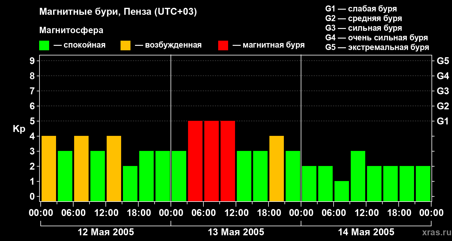 Изменения геомагнитного индекса Kp с 12 по 14 мая 2005 года для средних широт