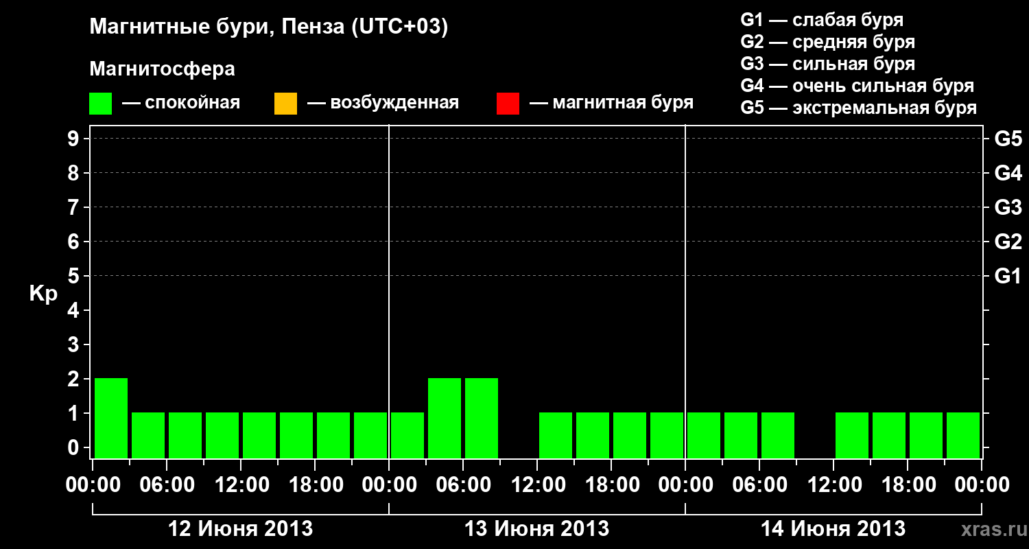Изменения геомагнитного индекса Kp с 12 по 14 июня 2013 года для средних широт