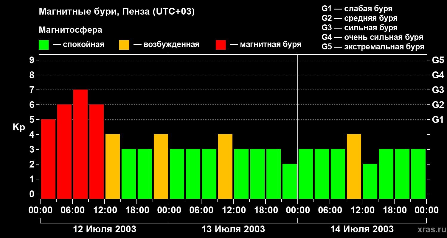 Изменения геомагнитного индекса Kp с 12 по 14 июля 2003 года для средних широт