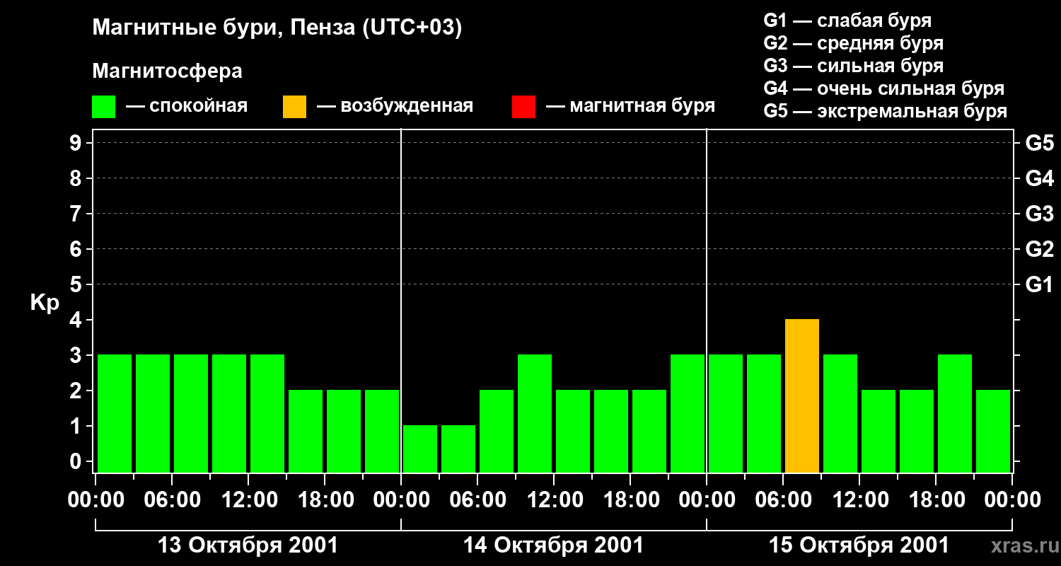 Изменения геомагнитного индекса Kp с 13 по 15 октября 2001 года для средних широт