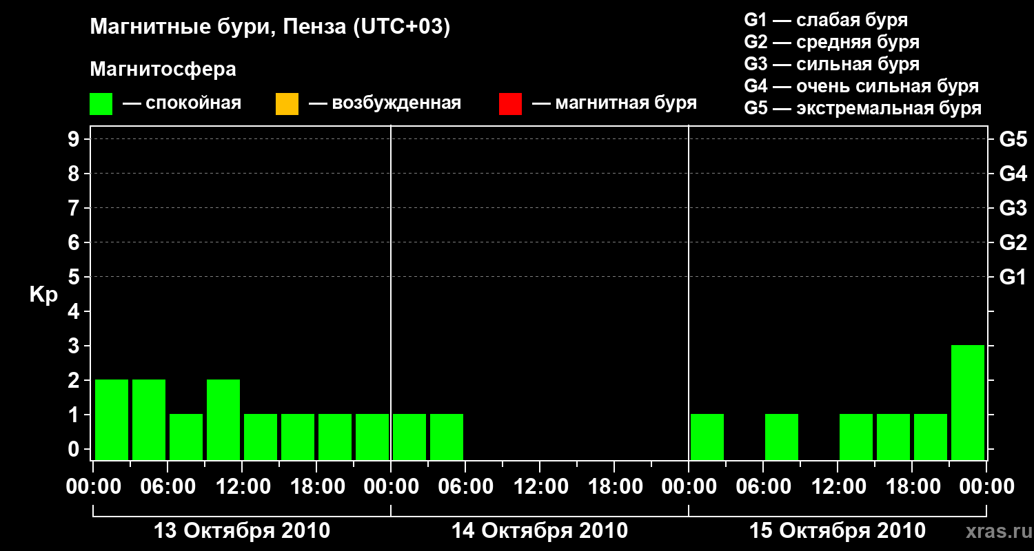 Изменения геомагнитного индекса Kp с 13 по 15 октября 2010 года для средних широт