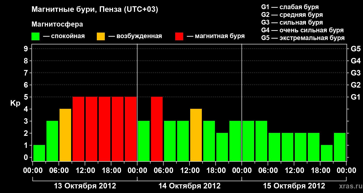 Изменения геомагнитного индекса Kp с 13 по 15 октября 2012 года для средних широт