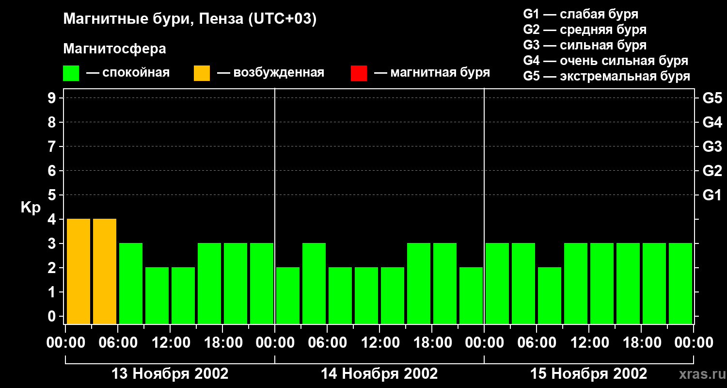 Изменения геомагнитного индекса Kp с 13 по 15 ноября 2002 года для средних широт