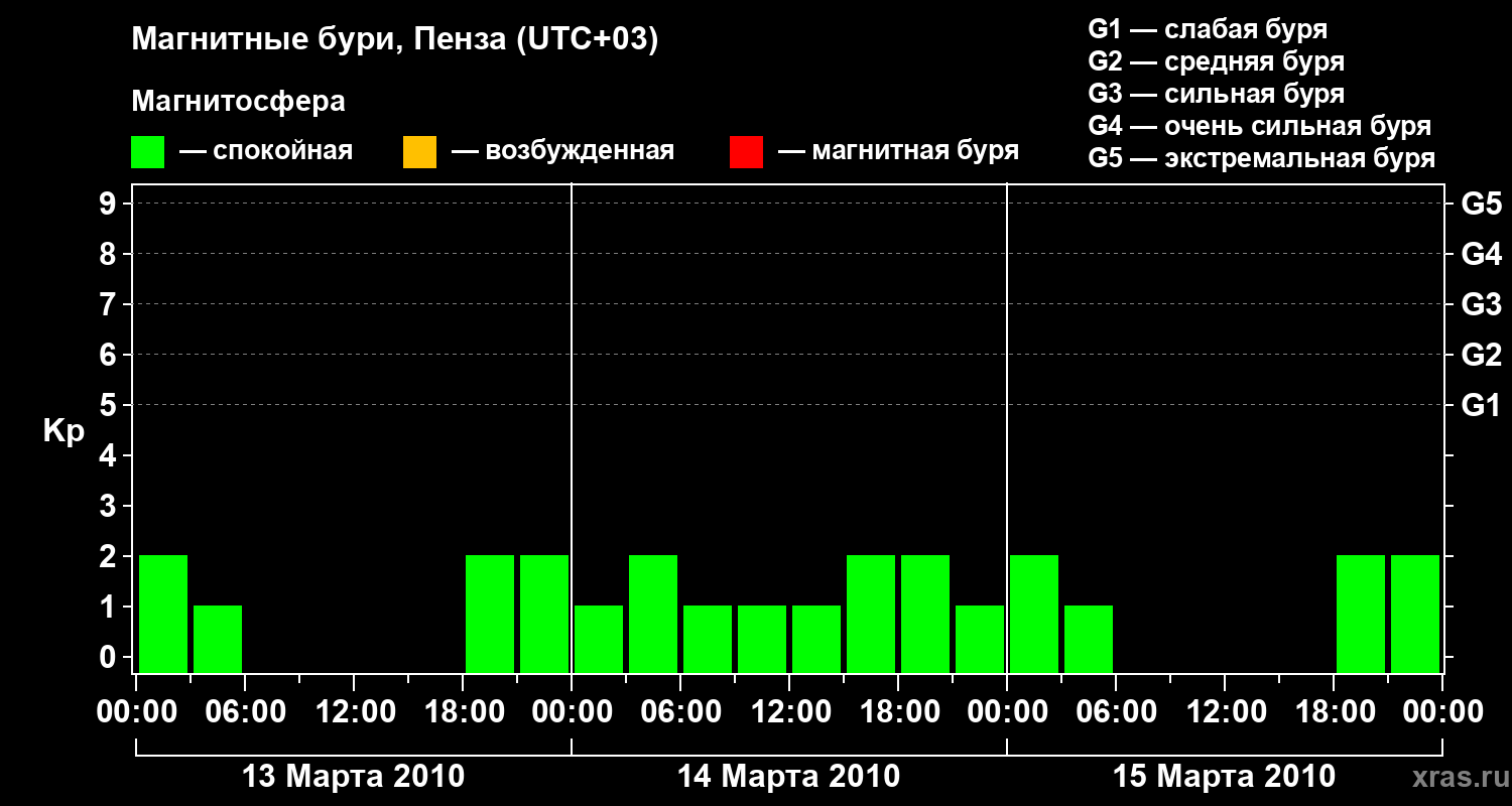 Изменения геомагнитного индекса Kp с 13 по 15 марта 2010 года для средних широт