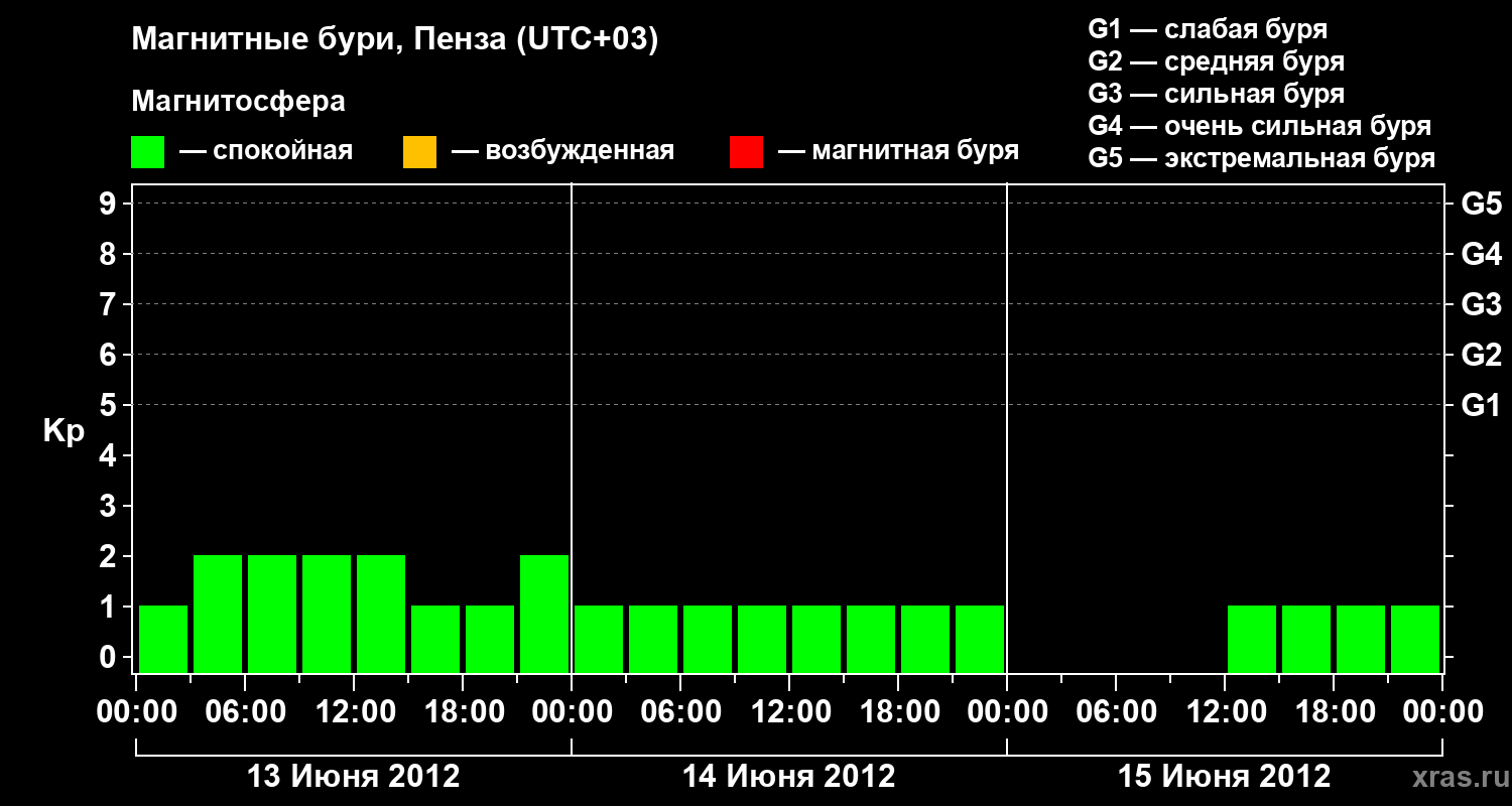 Изменения геомагнитного индекса Kp с 13 по 15 июня 2012 года для средних широт