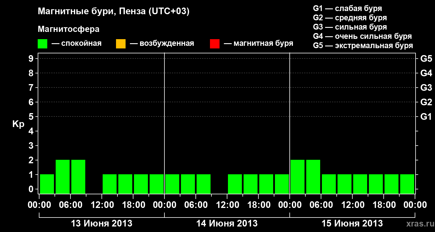 Изменения геомагнитного индекса Kp с 13 по 15 июня 2013 года для средних широт