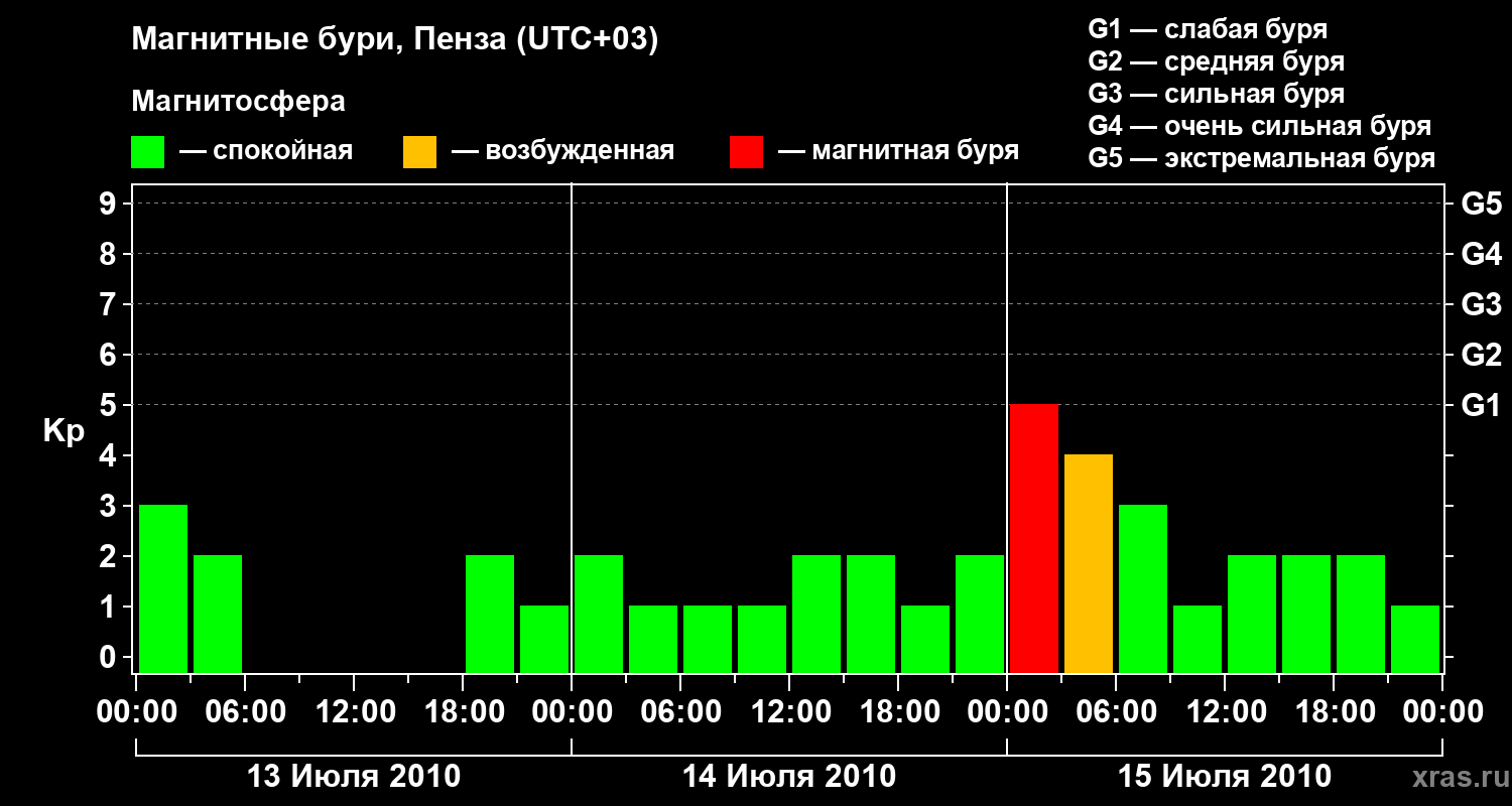 Изменения геомагнитного индекса Kp с 13 по 15 июля 2010 года для средних широт