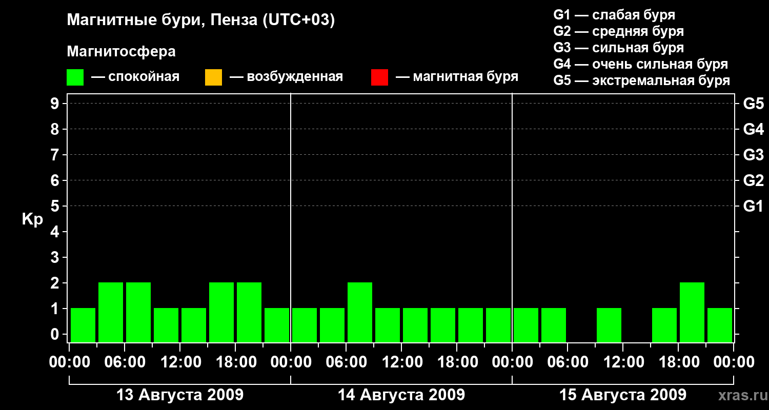 Изменения геомагнитного индекса Kp с 13 по 15 августа 2009 года для средних широт