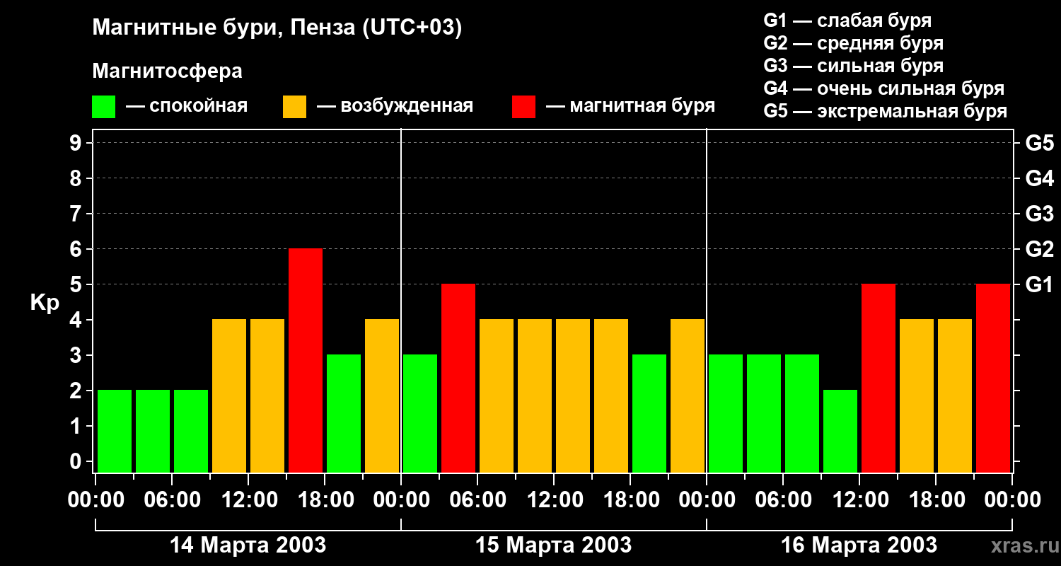 Изменения геомагнитного индекса Kp с 14 по 16 марта 2003 года для средних широт