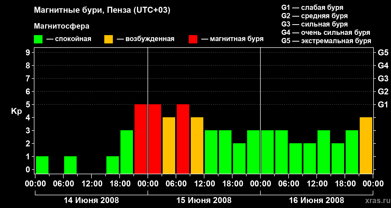 Изменения геомагнитного индекса Kp с 14 по 16 июня 2008 года для средних широт