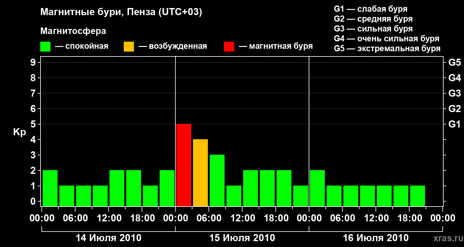 Изменения геомагнитного индекса Kp с 14 по 16 июля 2010 года для средних широт