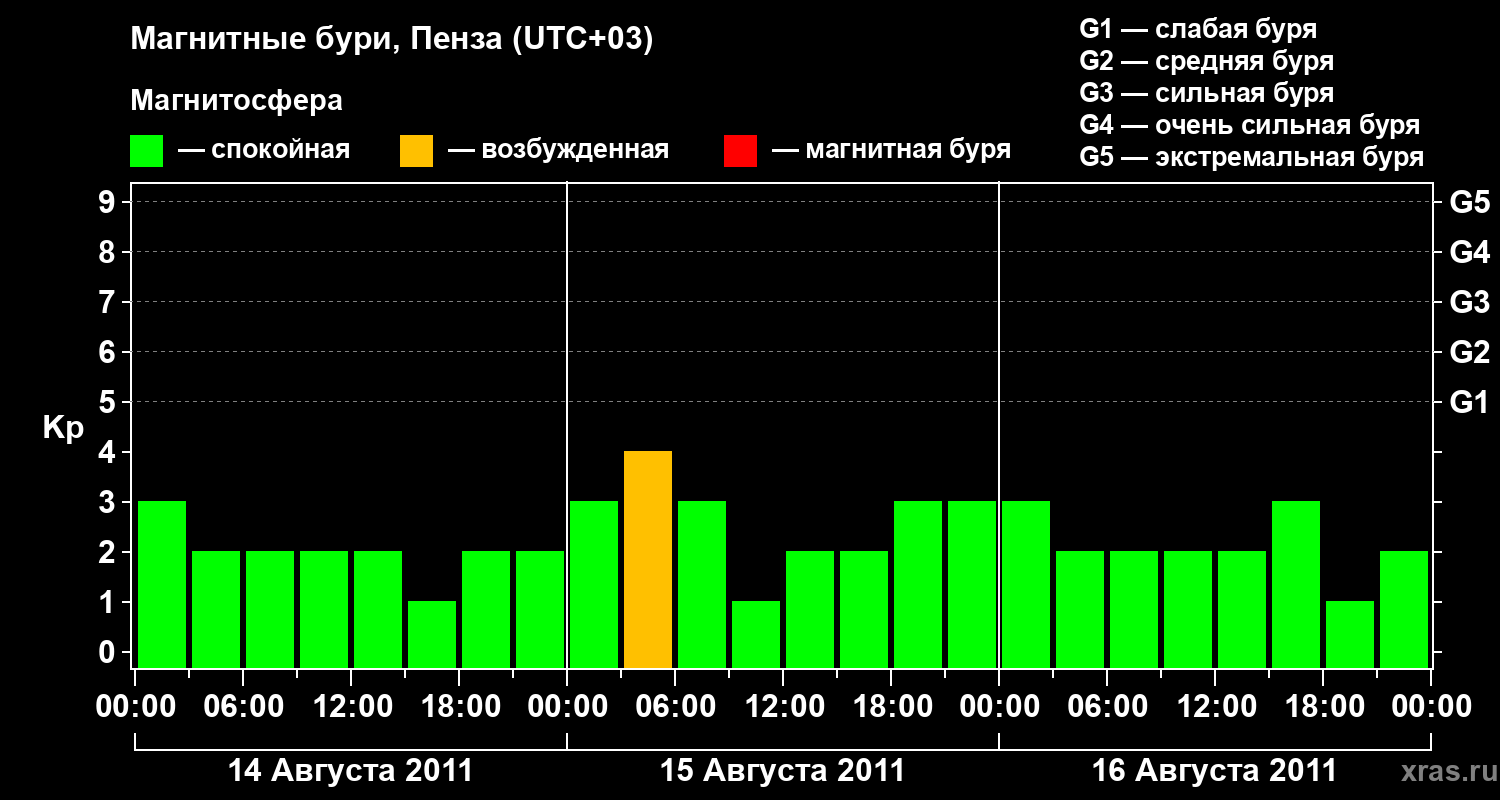 Изменения геомагнитного индекса Kp с 14 по 16 августа 2011 года для средних широт