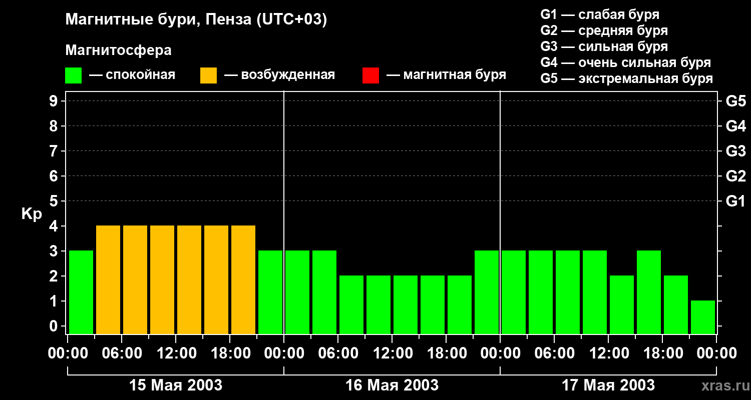 Изменения геомагнитного индекса Kp с 15 по 17 мая 2003 года для средних широт