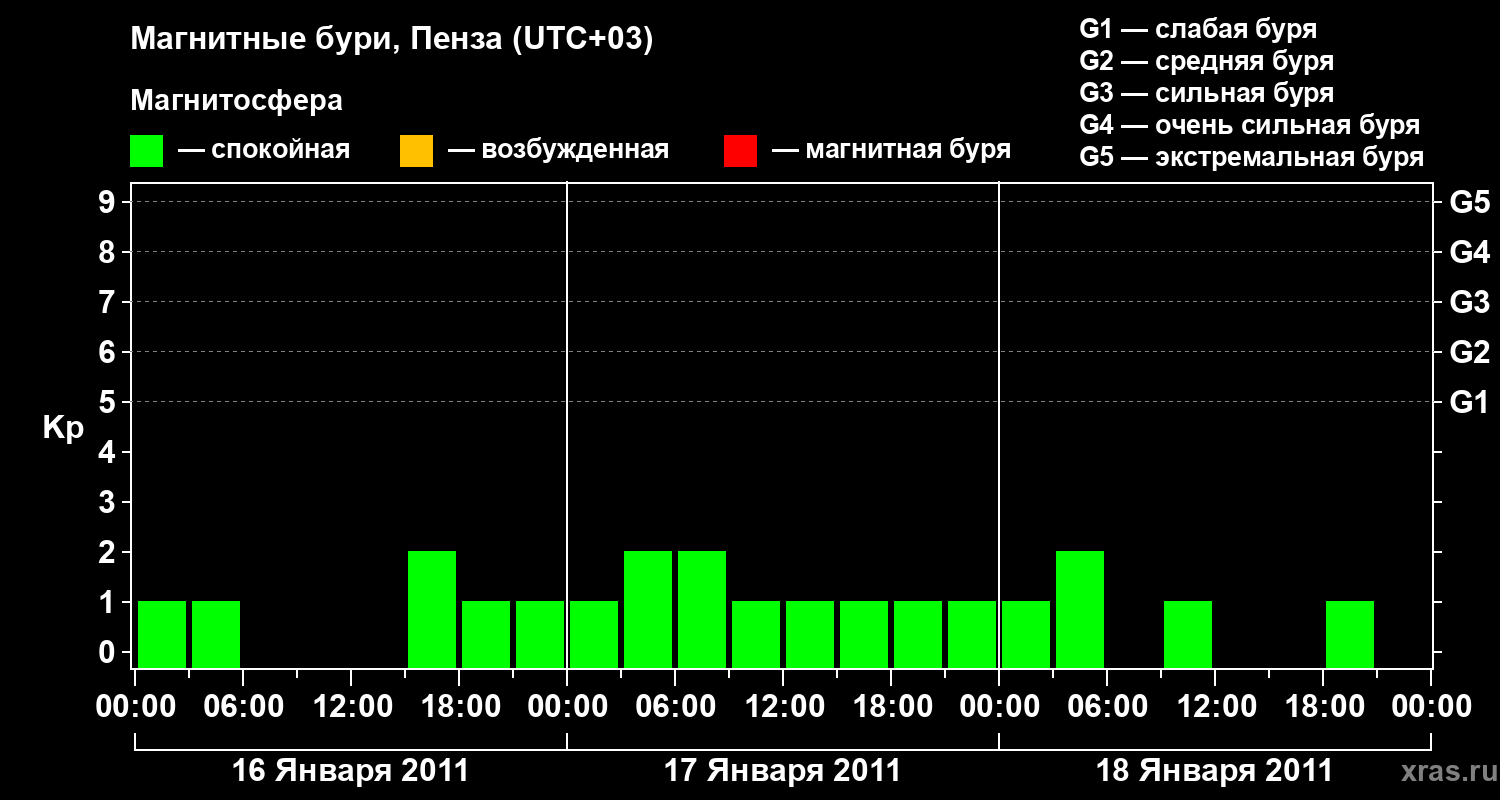 Изменения геомагнитного индекса Kp с 16 по 18 января 2011 года для средних широт