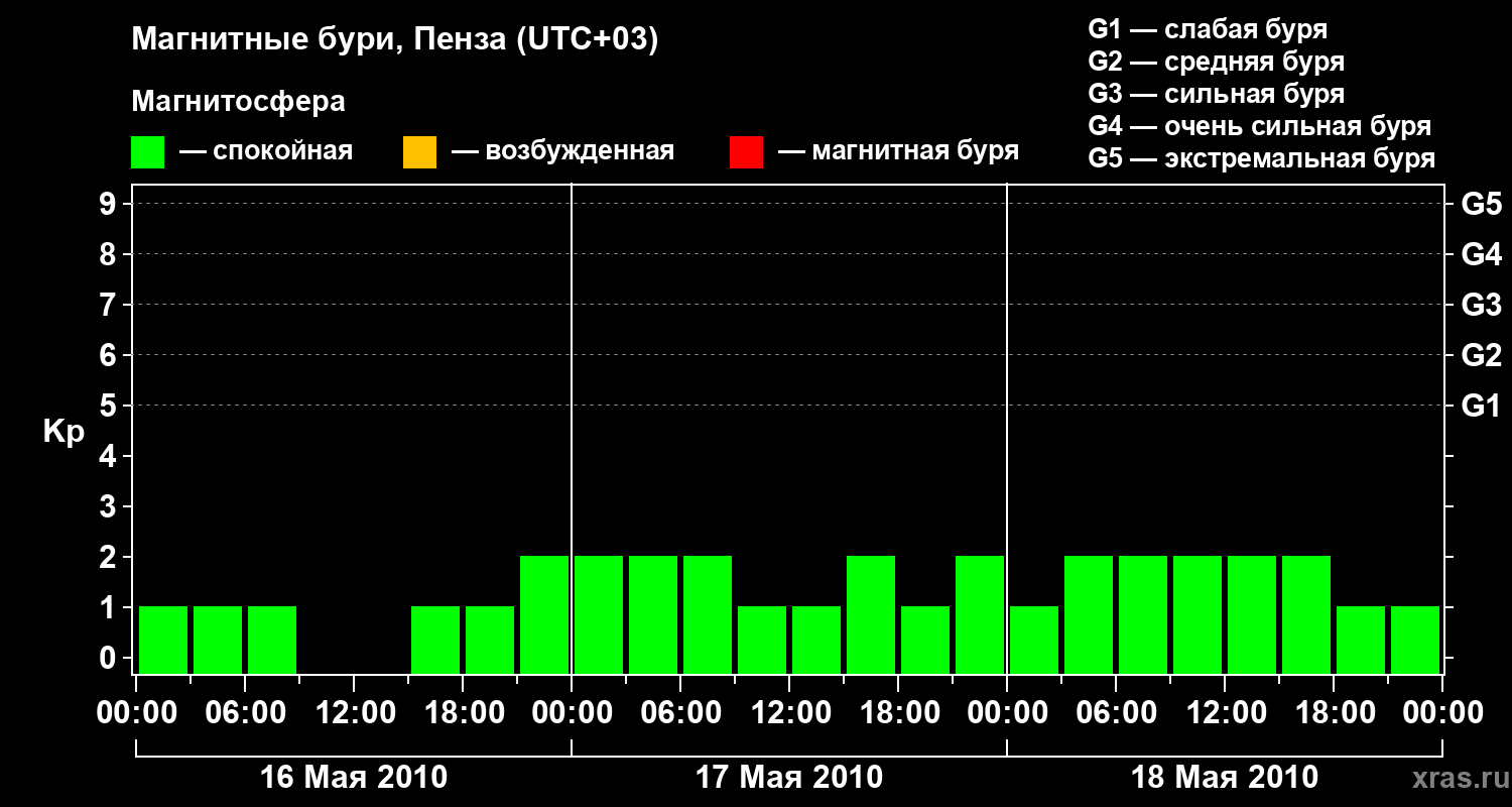 Изменения геомагнитного индекса Kp с 16 по 18 мая 2010 года для средних широт