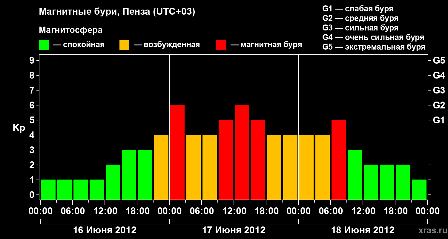 Изменения геомагнитного индекса Kp с 16 по 18 июня 2012 года для средних широт