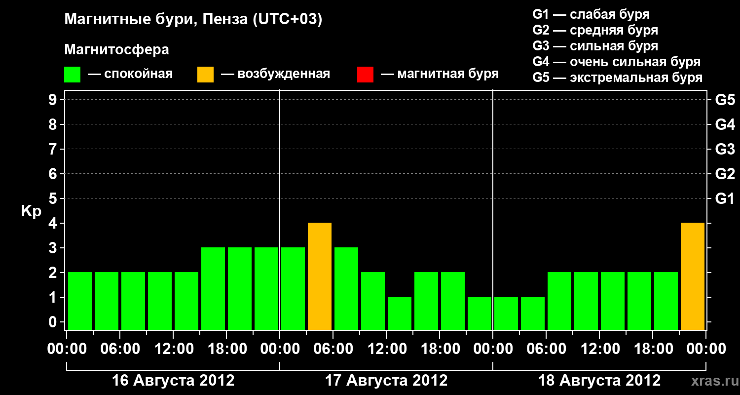Изменения геомагнитного индекса Kp с 16 по 18 августа 2012 года для средних широт
