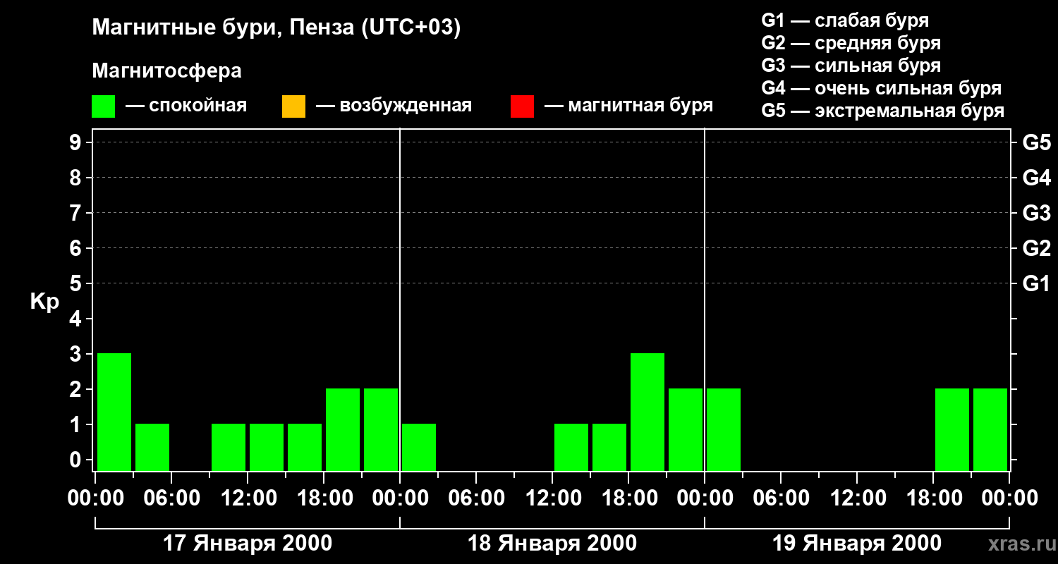 Изменения геомагнитного индекса Kp с 17 по 19 января 2000 года для средних широт