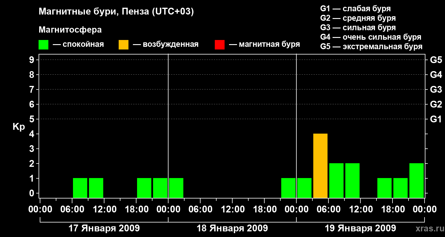 Изменения геомагнитного индекса Kp с 17 по 19 января 2009 года для средних широт