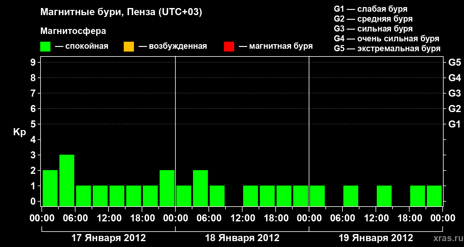 Изменения геомагнитного индекса Kp с 17 по 19 января 2012 года для средних широт