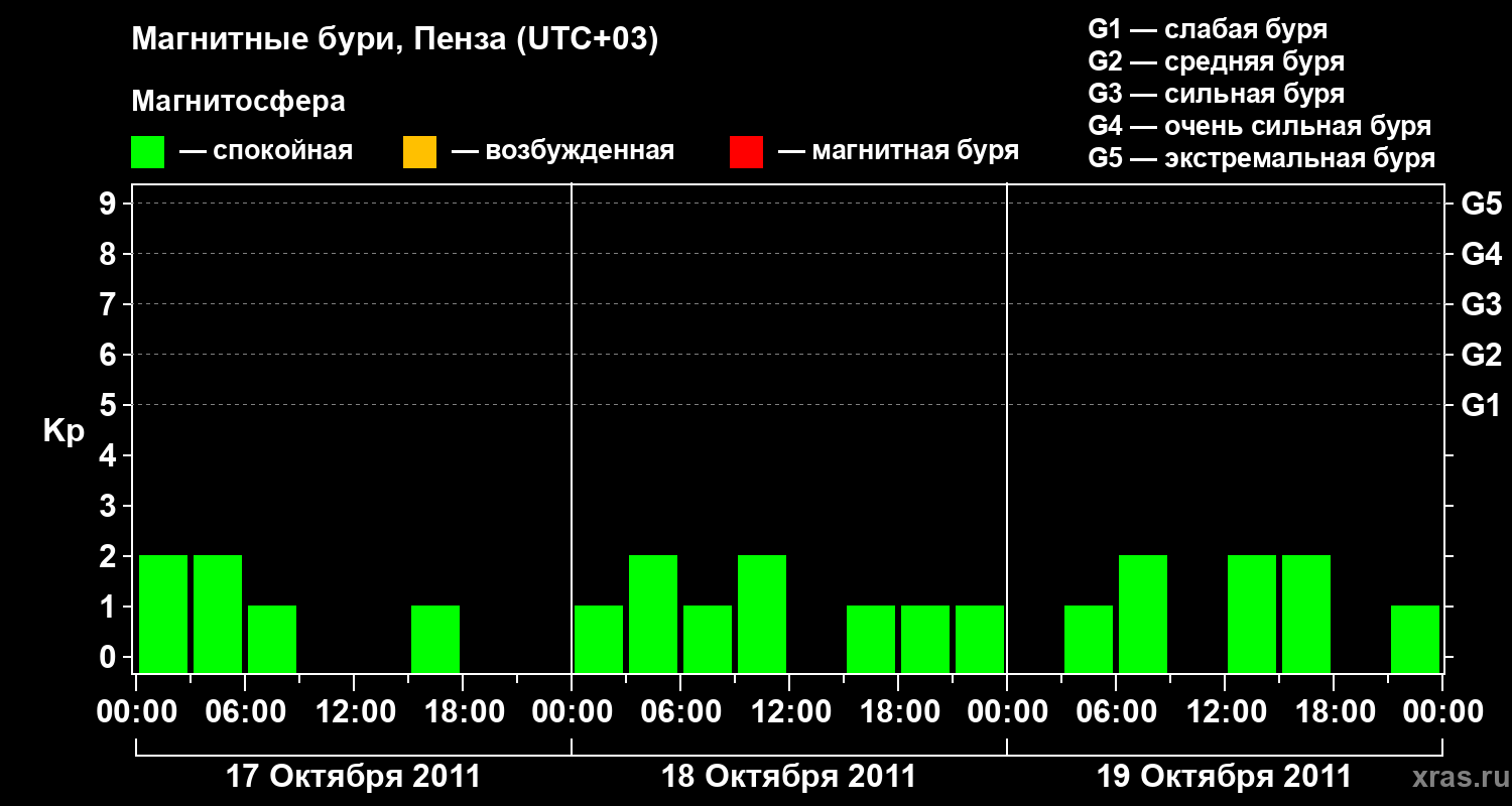 Изменения геомагнитного индекса Kp с 17 по 19 октября 2011 года для средних широт