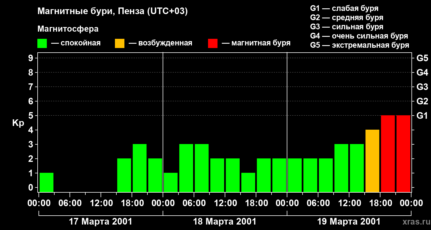 Изменения геомагнитного индекса Kp с 17 по 19 марта 2001 года для средних широт
