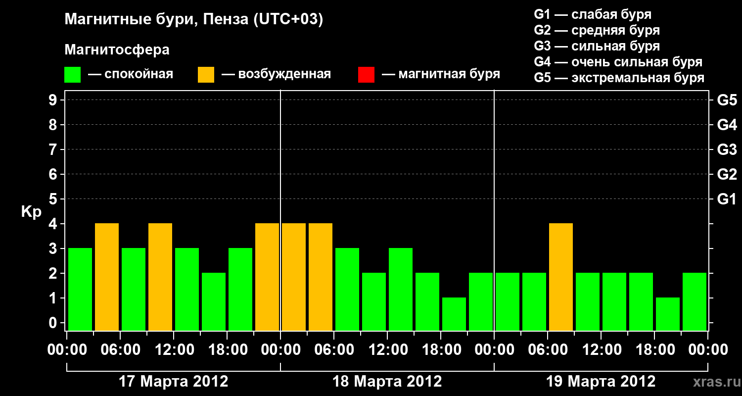 Изменения геомагнитного индекса Kp с 17 по 19 марта 2012 года для средних широт