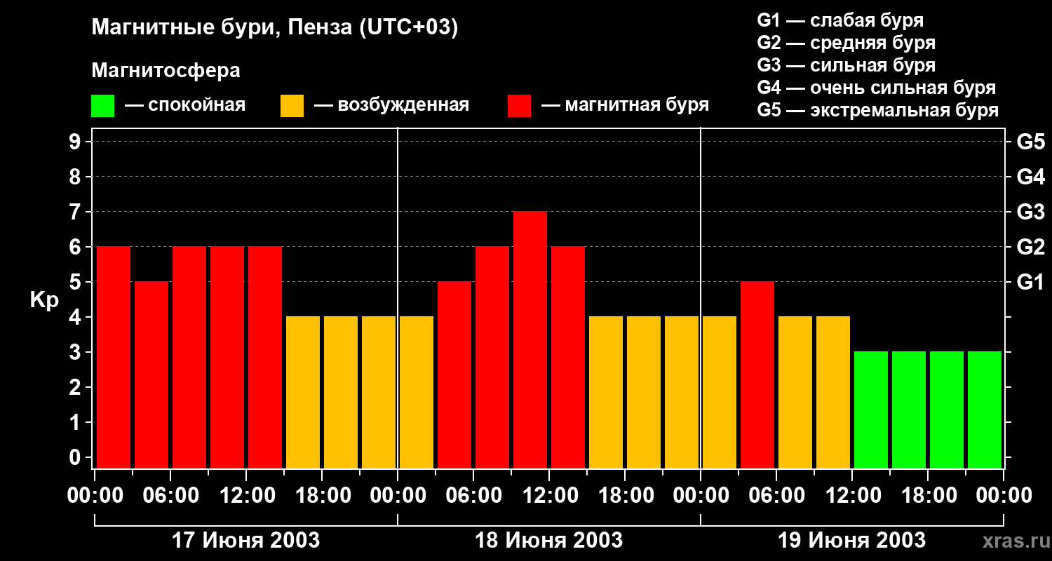 Изменения геомагнитного индекса Kp с 17 по 19 июня 2003 года для средних широт