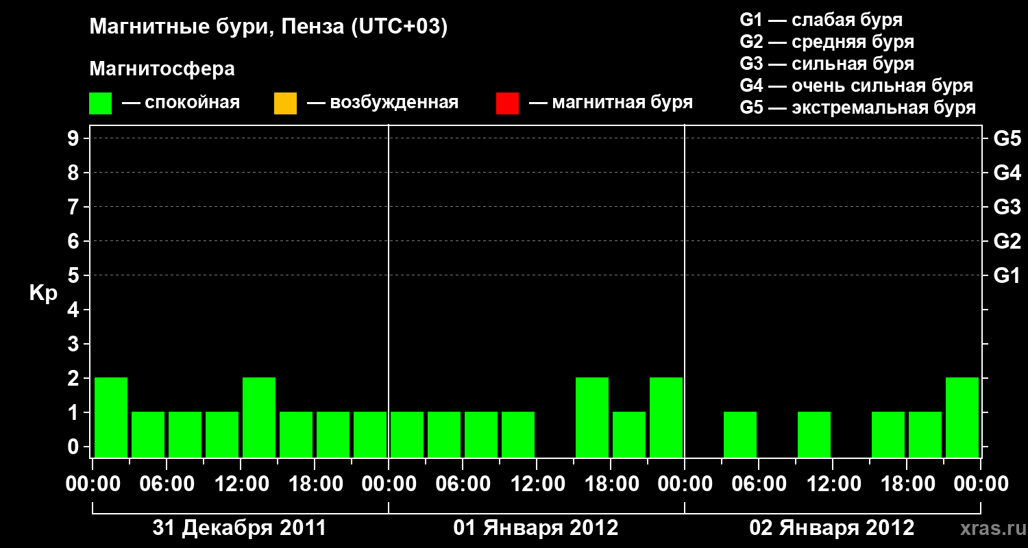 Изменения геомагнитного индекса Kp с 31 декабря 2011 года по 2 января 2012 года для средних широт