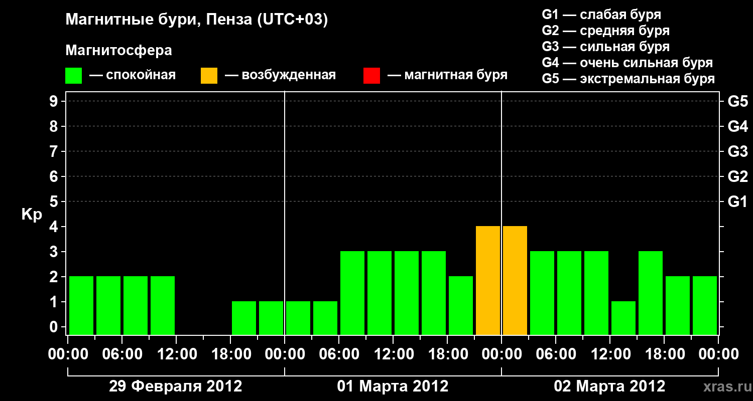 Изменения геомагнитного индекса Kp с 29 февраля по 2 марта 2012 года для средних широт