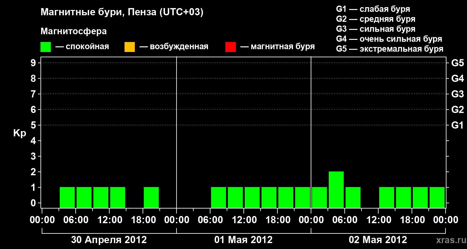 Изменения геомагнитного индекса Kp с 30 апреля по 2 мая 2012 года для средних широт