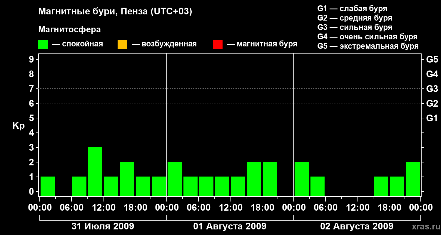 Изменения геомагнитного индекса Kp с 31 июля по 2 августа 2009 года для средних широт