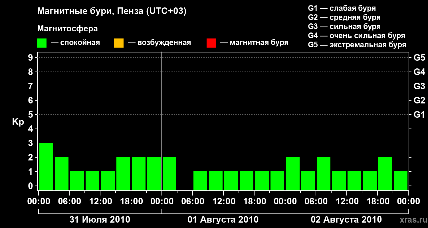 Изменения геомагнитного индекса Kp с 31 июля по 2 августа 2010 года для средних широт