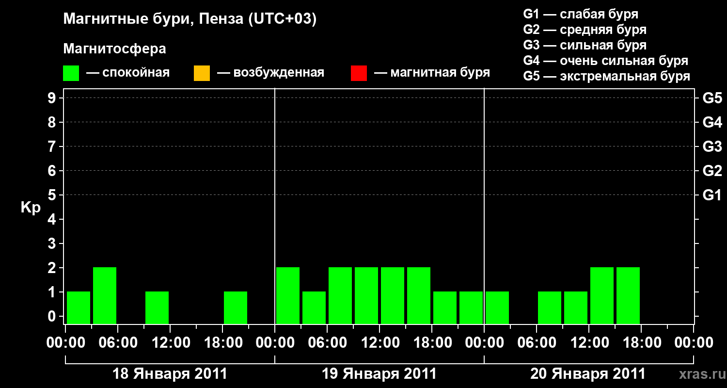 Изменения геомагнитного индекса Kp с 18 по 20 января 2011 года для средних широт