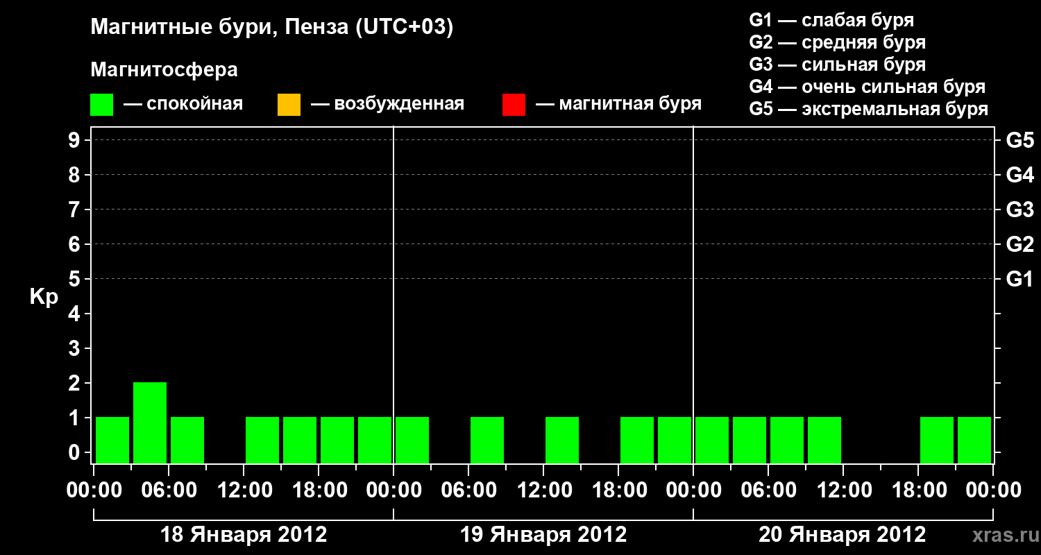 Изменения геомагнитного индекса Kp с 18 по 20 января 2012 года для средних широт
