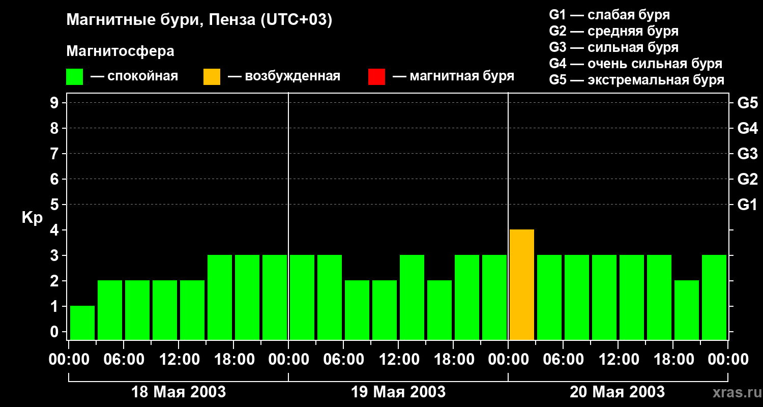 Изменения геомагнитного индекса Kp с 18 по 20 мая 2003 года для средних широт