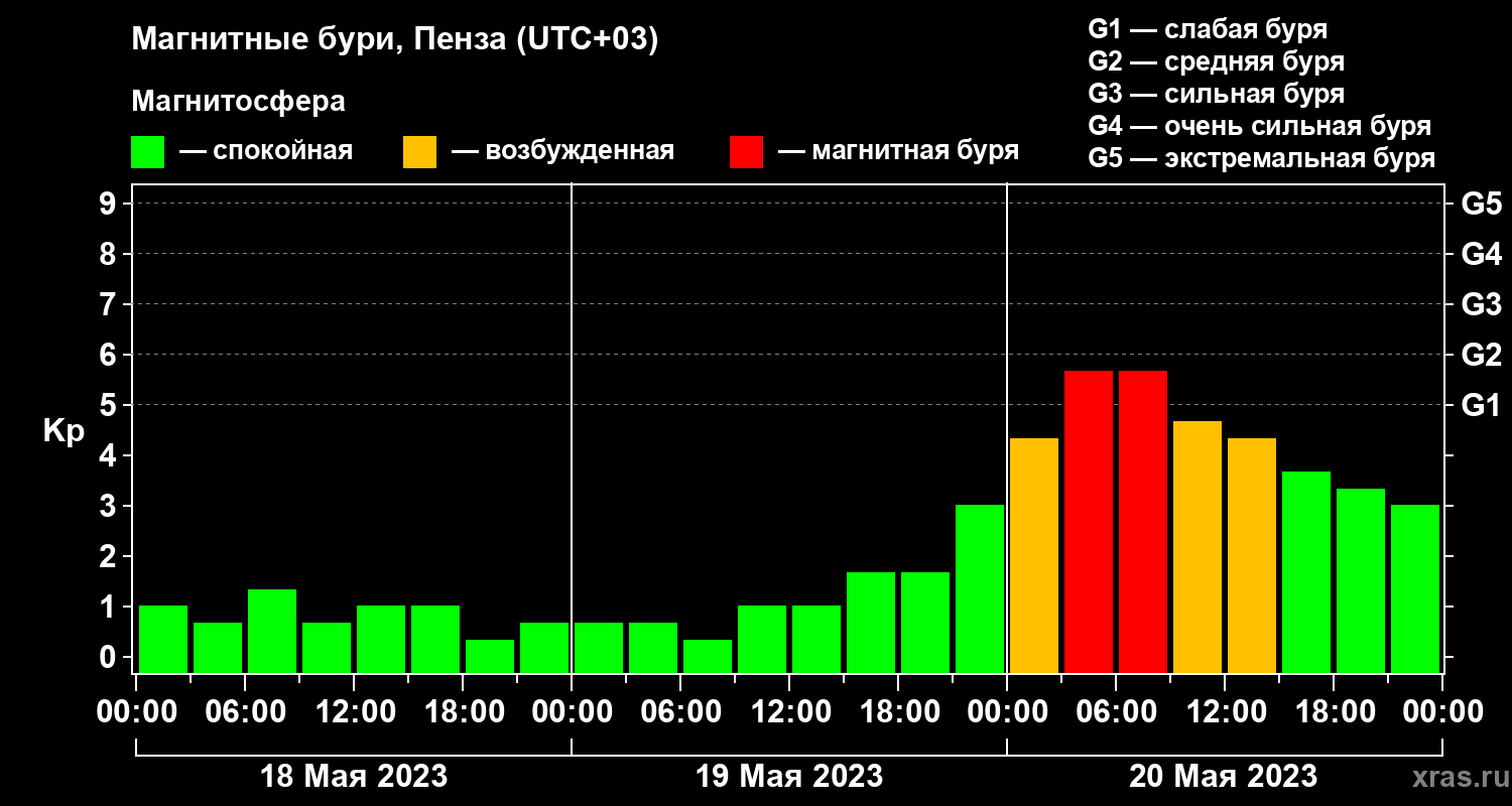 Изменения геомагнитного индекса Kp с 18 по 20 мая 2023 года для средних широт
