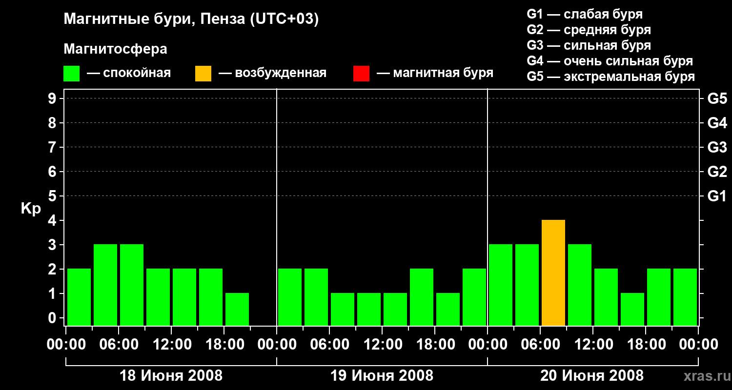 Изменения геомагнитного индекса Kp с 18 по 20 июня 2008 года для средних широт