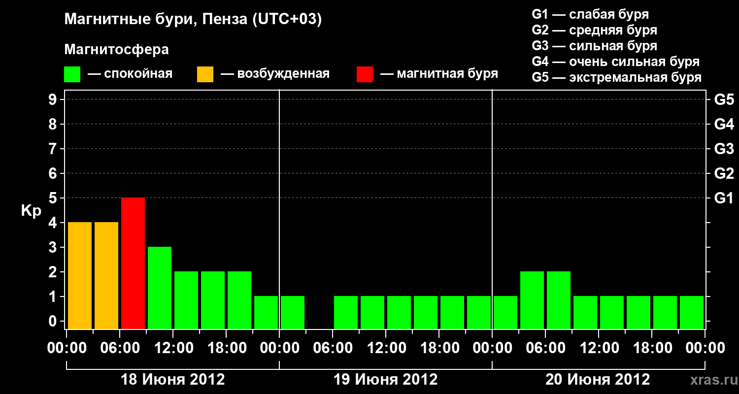 Изменения геомагнитного индекса Kp с 18 по 20 июня 2012 года для средних широт