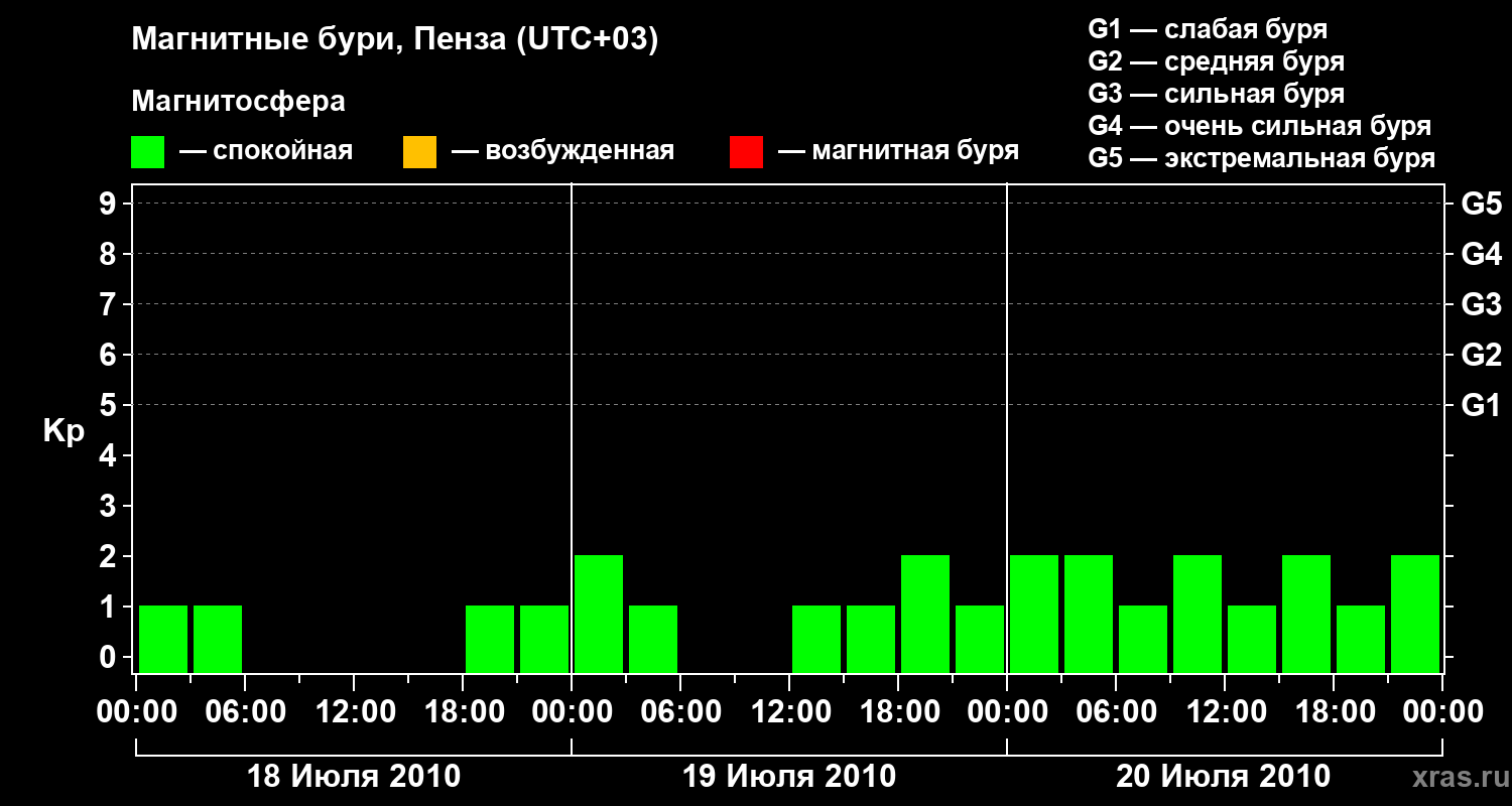 Изменения геомагнитного индекса Kp с 18 по 20 июля 2010 года для средних широт