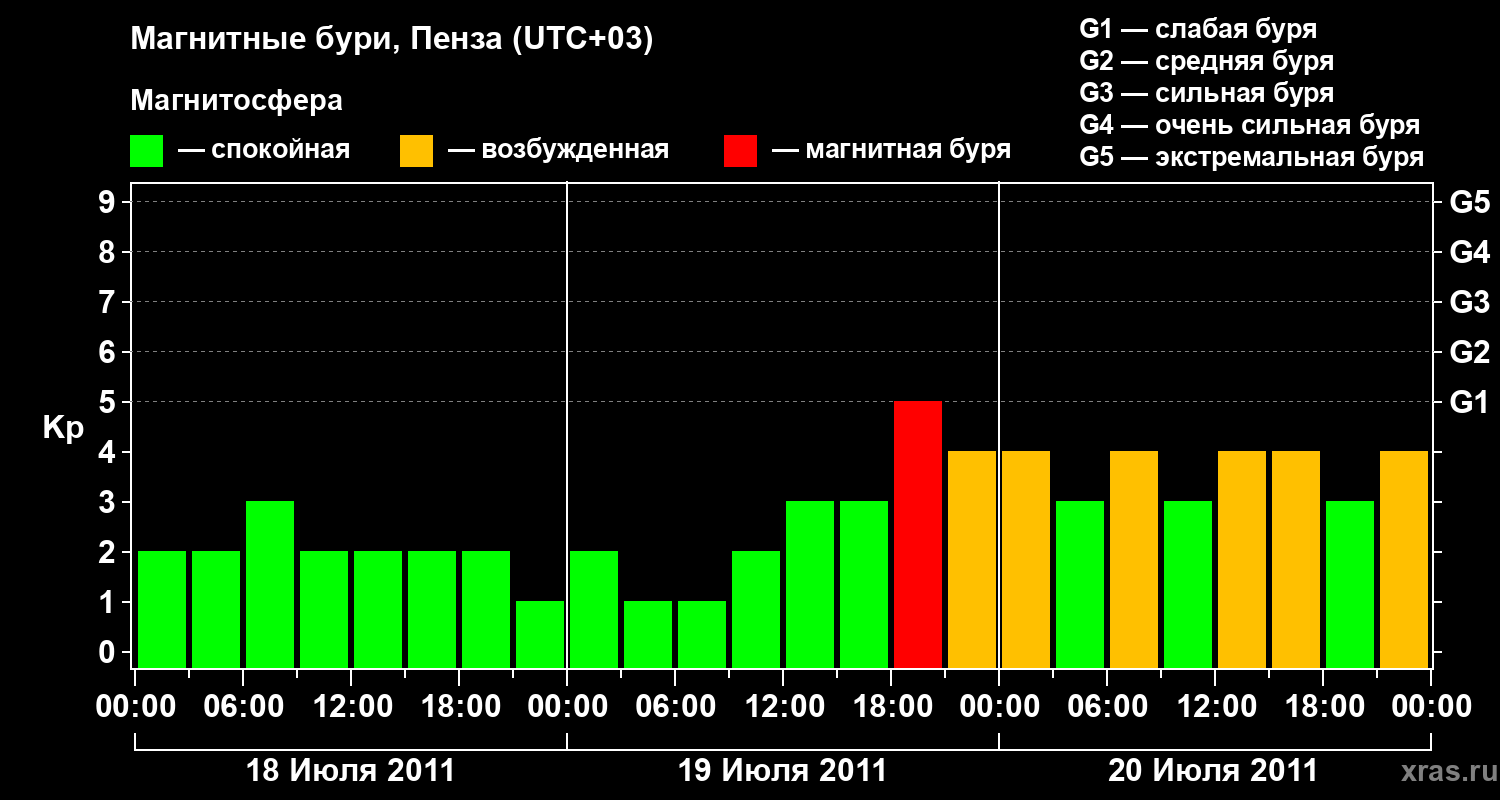 Изменения геомагнитного индекса Kp с 18 по 20 июля 2011 года для средних широт