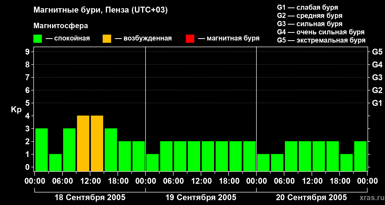 Изменения геомагнитного индекса Kp с 18 по 20 сентября 2005 года для средних широт