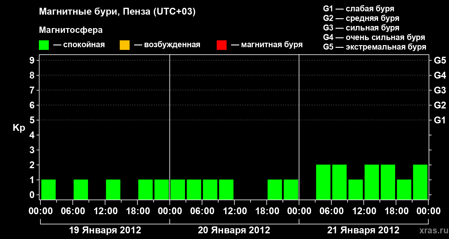 Изменения геомагнитного индекса Kp с 19 по 21 января 2012 года для средних широт