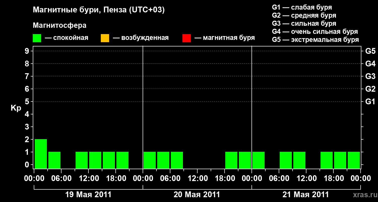 Изменения геомагнитного индекса Kp с 19 по 21 мая 2011 года для средних широт