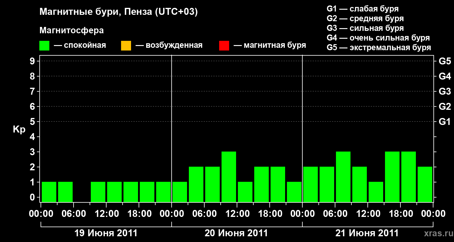 Изменения геомагнитного индекса Kp с 19 по 21 июня 2011 года для средних широт