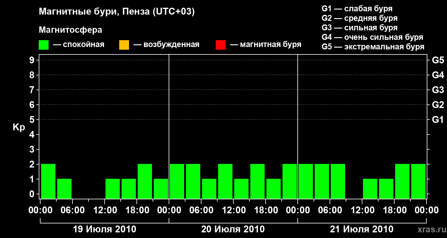 Изменения геомагнитного индекса Kp с 19 по 21 июля 2010 года для средних широт